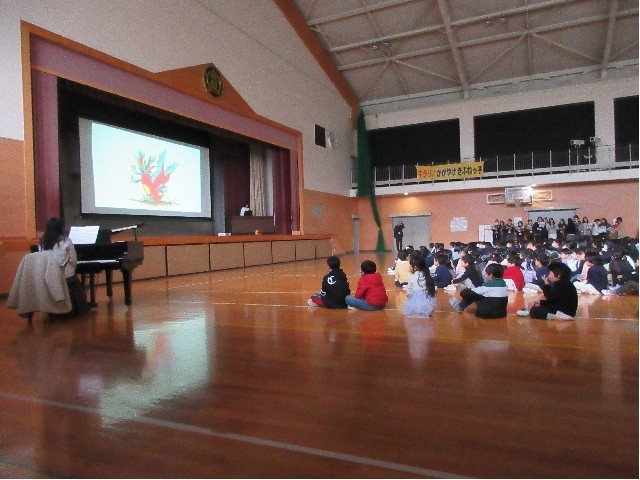 本日、体育館にて「ひだまり」の皆様による、全校読み聞かせが行われました。