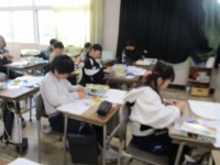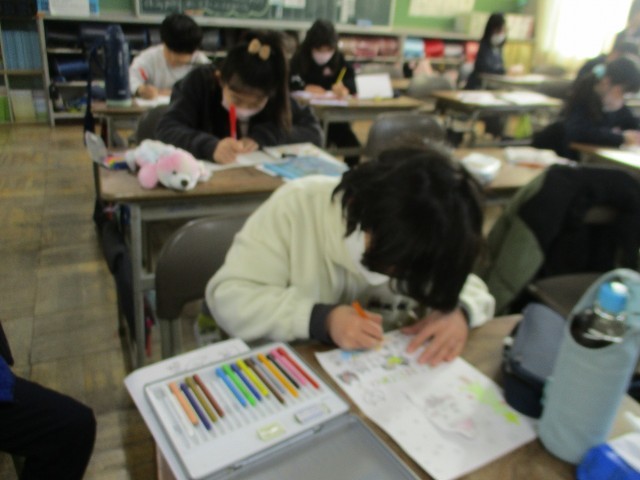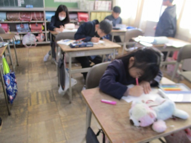 図工の授業で、メッセージカードづくりをしました。メッセージを届けたい相手を決めて、喜んでもらえるように絵やメッセージを一生懸命考えて書いて、丁寧に色塗りをしていました。渡したときに喜んでもらえるといいですね。