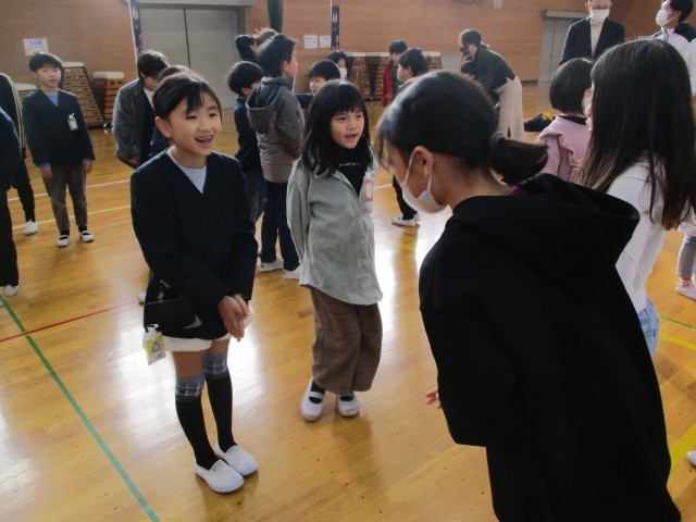 ペア学年の4年生のみなさんが、○×ゲームや片足じゃんけんなど、楽しい遊びを考えてくれて、一緒に遊びました。