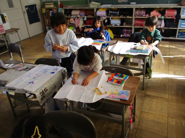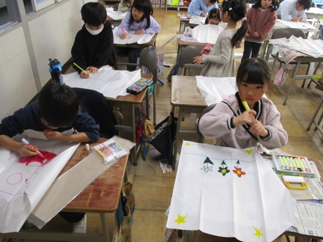 来週、生活科「ふゆをたのしもう」の学習で凧あげをします。今日は凧の絵をかきました。自分の好きなものを紙いっぱいにかくことができました。
