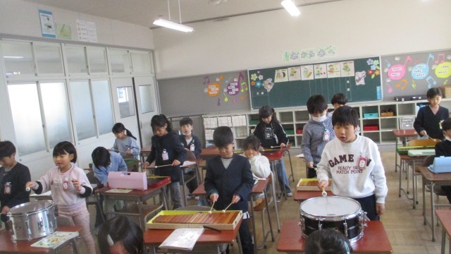 音楽では、「汽車は走る」の楽器演奏をしました。上手になりました。