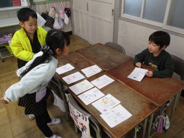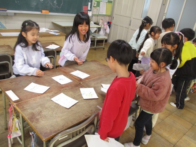 国語の「ものの名まえ」の学習で、ものの名まえを集めてお店やさんごっこをしました。「いらっしゃいませ。」「〇〇をください。」と元気よく言って買い物を楽しんでいました。
