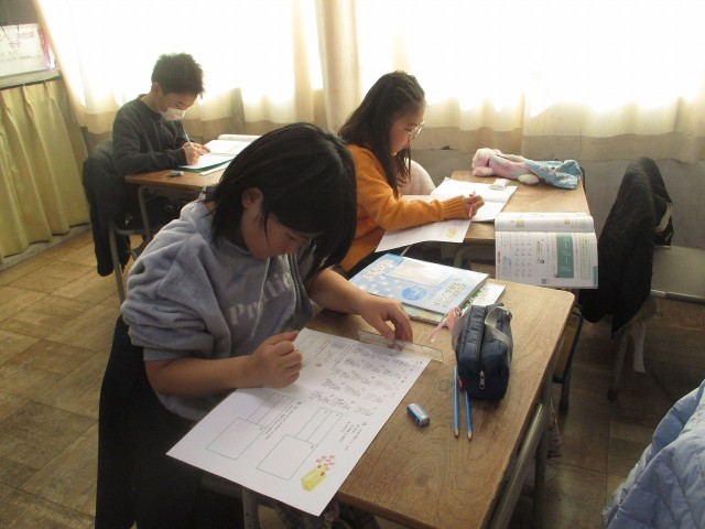 算数では、2けたをかけるかけ算の筆算をしています。九九が正確に言えることと、計算する順番やくり上がりを書く場所など気を付けることがたくさんあるので、反復練習をしてできるように頑張っています。