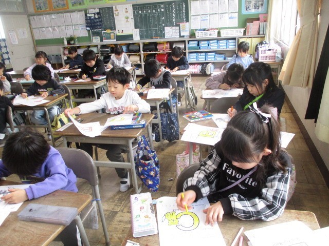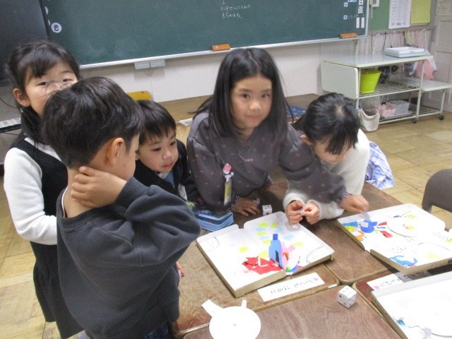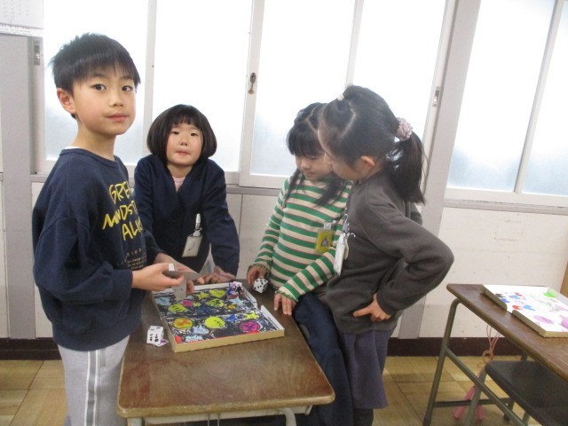 今日は雨の1日でした。外で遊べないので、この間図工で作ったすごろくで遊びました。手作りのよさがいっぱいの楽しいすごろくを家でもやってみてくださいね。写真は1年生最後の英語活動と班ですごろく遊びをしているところです。