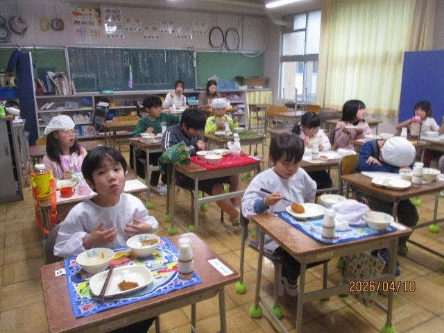 給食のルールを確認した後、今年度初めての給食を食べました。片付けも一人一人がきちんとできました。その後は歯磨きも行いました。来週からは、国語や算数の学習も始まります。みんなが笑顔で元気に登校してくるのが楽しみです。