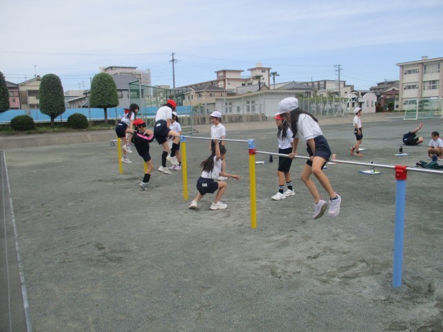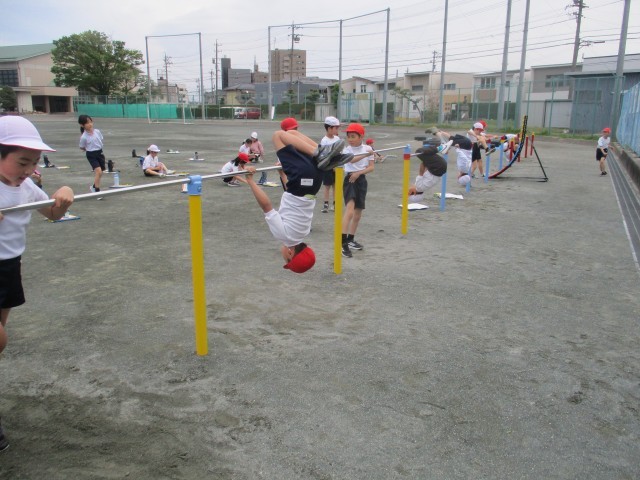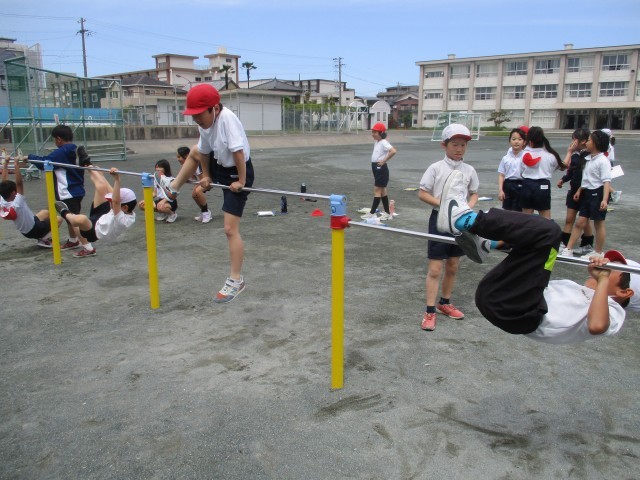 体育の学習では、「鉄棒運動」が始まりました。友達と教え合いながら、技の練習をしました。