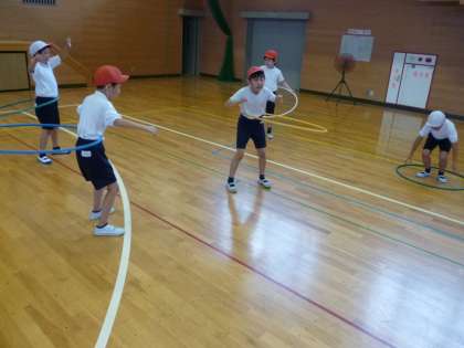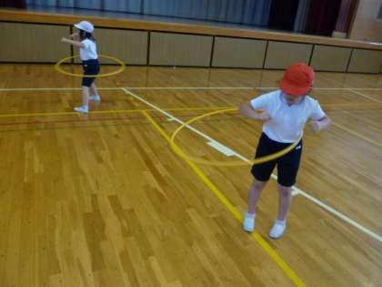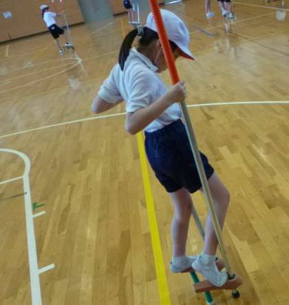 今日の体育では、竹馬とフラフープに挑戦しました。竹馬は苦戦しながらも声を掛け合って、授業の終わりには多くの子が上手に乗れるようになりました。フラフープは友達同士で、競い合うなどして楽しんでいました。
