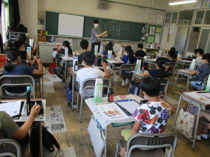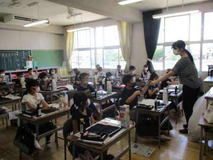 毛筆の学習が始まりました。子どもたちは、道具の出し方や紙の折り方など先生の説明をしっかり聞いて準備をしました。緊張しながら筆に墨をつけていましたが、白い紙に縦画や横画が書けたときにはみんな笑顔になっていました。これからもたくさん練習して、上手になってほしいと思います。