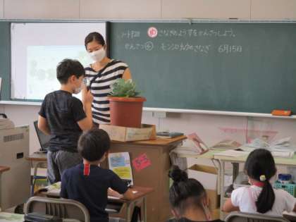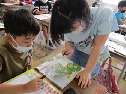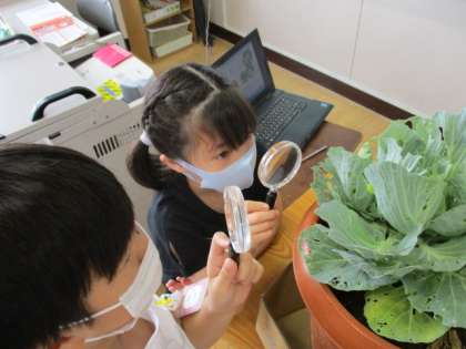 理科の授業で、モンシロチョウのさなぎの観察をしました。虫眼鏡を使ってじっくりと観察をしていました。虫眼鏡を使った後には手指の消毒をしました。