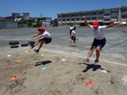 5年 走り幅跳び 6/17 公開日 2020/06/17 更新日 2020/06/17 5年 5年生は、外体育で走り幅跳びを学習しています。踏み切りの仕方や手の振り方に気を付けて、練習に励んでいます。友達の良い跳び方を見て、記録を伸ばしてほしいと思います。