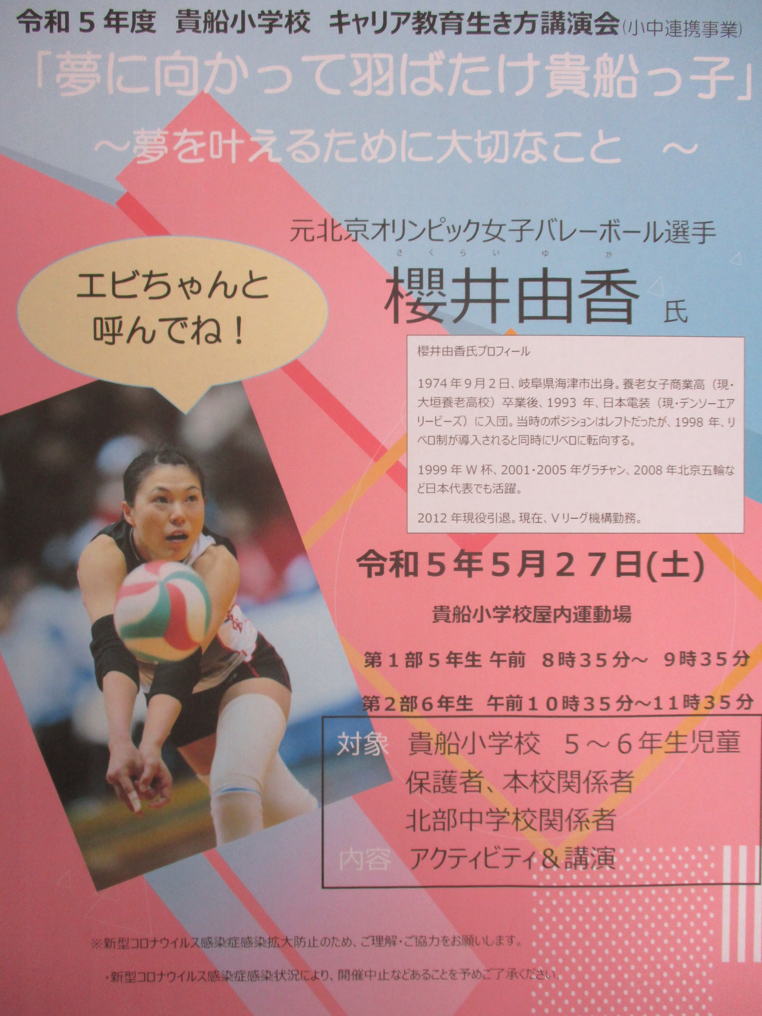 ※チラシはこちら☞「令和5年度 貴船小学校キャリア教育生き方講演会(櫻井由香氏)2」