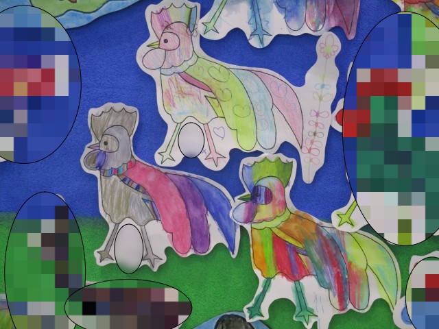 講師の方に来ていただき、色付け体験をした作品が飾られていました。屏風の作品の一部として、すてきに飾っていただきました。水をつけて溶かす色えんぴつ、楽しかったね。