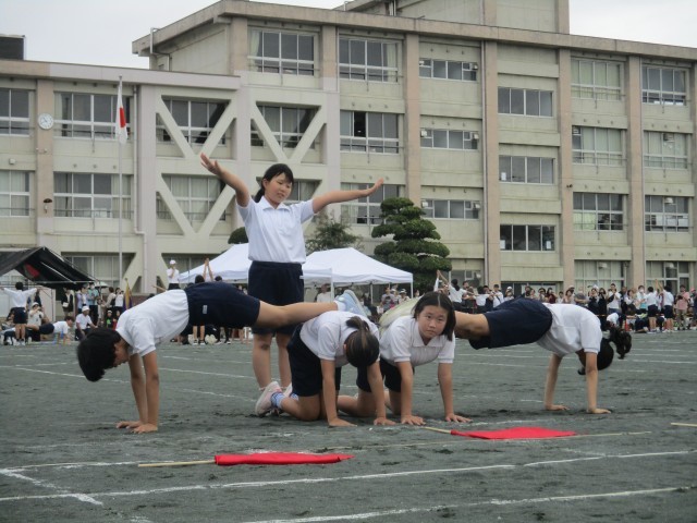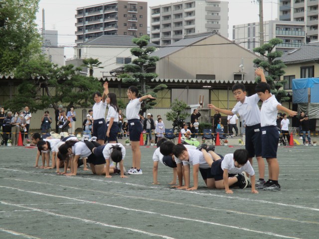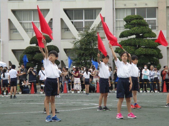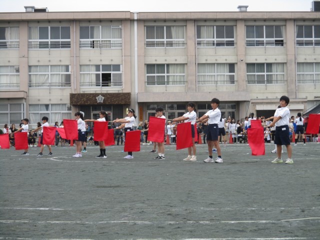 高学年は「青春」をテーマに、組み立て体操とフラッグ演技を行いました。約一か月の練習を通して、大きく成長してきた子どもたち。今日まで練習してきた仲間とともに、最高の演技をすることができました。