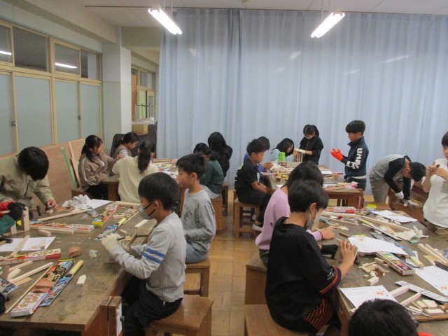 4年生になり、いよいよ「のこぎり」も使い始め、さらに本格的な作品づくりに挑戦しています。思い思いのアイデアを、トンカチとのこぎりを操りながら形にする姿には、目覚ましい成長が感じられます。