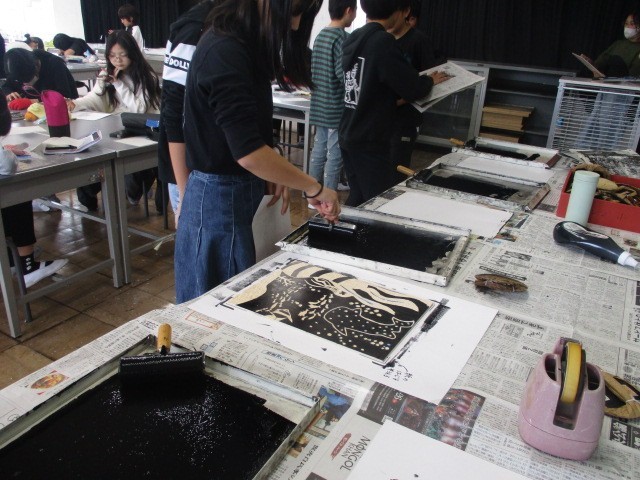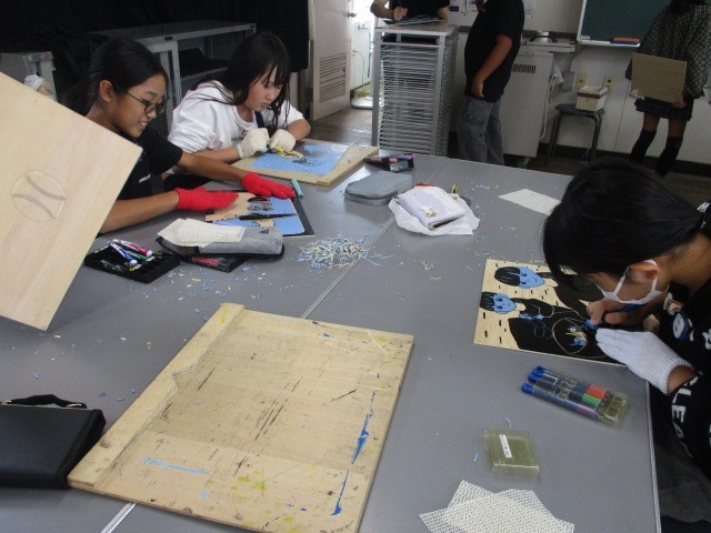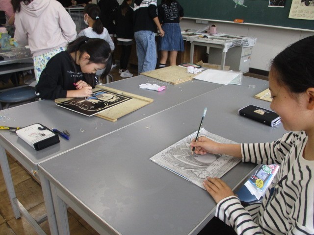 細かいところは特に丁寧に彫刻刀で版を掘っています。