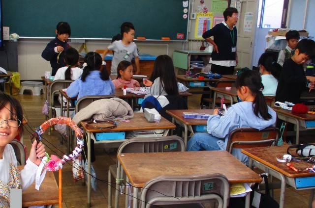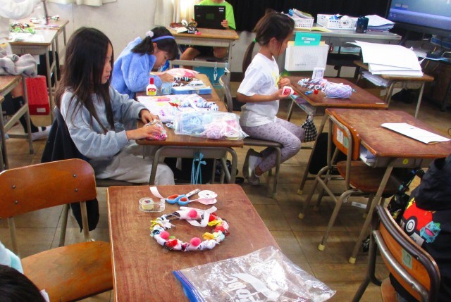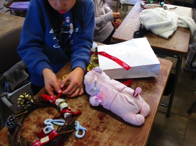 学校の畑で育てたサツマイモのつるを使ってリースを作っています。