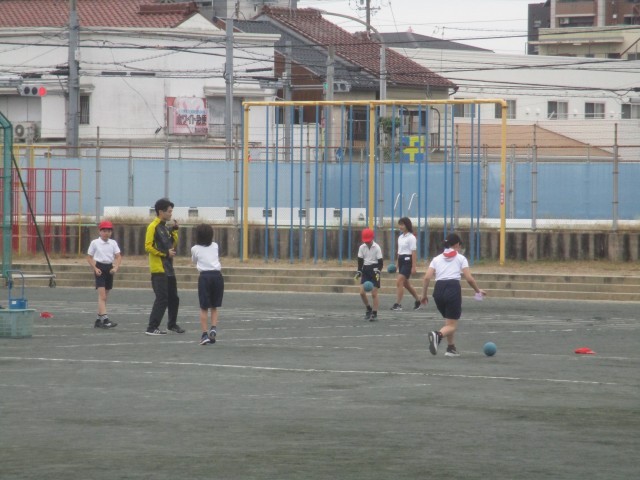 体育の学習では、ハンドボールを行いました。手のひらよりも少し大きめのボールをつかって、投げ合います。ドッチボールよりは、小さくて、ちょっと不思議な感じもしました。