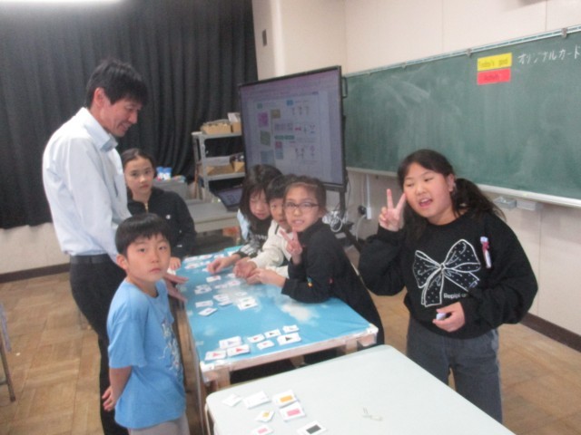 「何色のどんな形がほしいのかな」「イエロー、スター、プリーズ」「グリーン、トライアングル、プリーズ」と英語で伝えました。