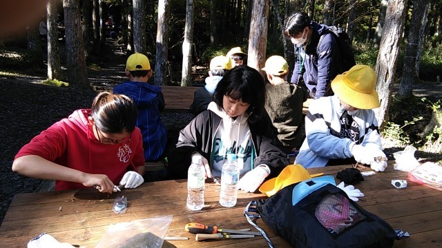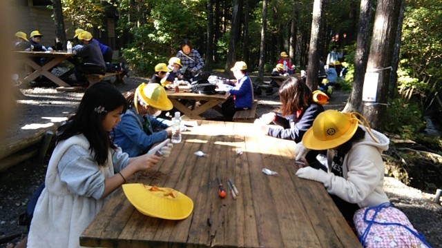 小川のせせらぎをBGMに、おしゃべりしながら楽しく悪戦苦闘中です。