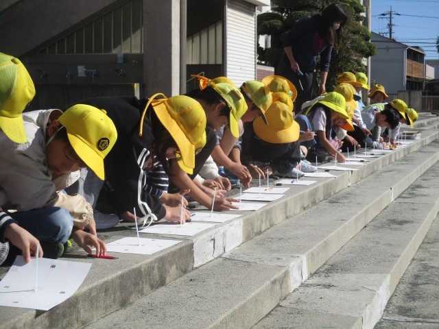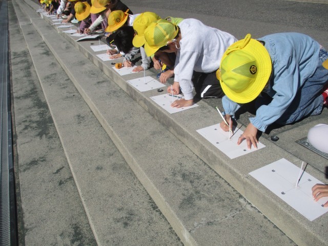 方位磁石で方角を確認し、太陽の位置と影のできる方向を確認しました。