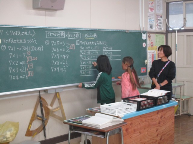 七のだんの九九を唱える声に導かれて教室に入りました。九九の学習がんばっています。