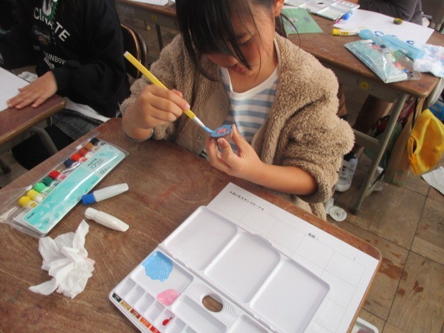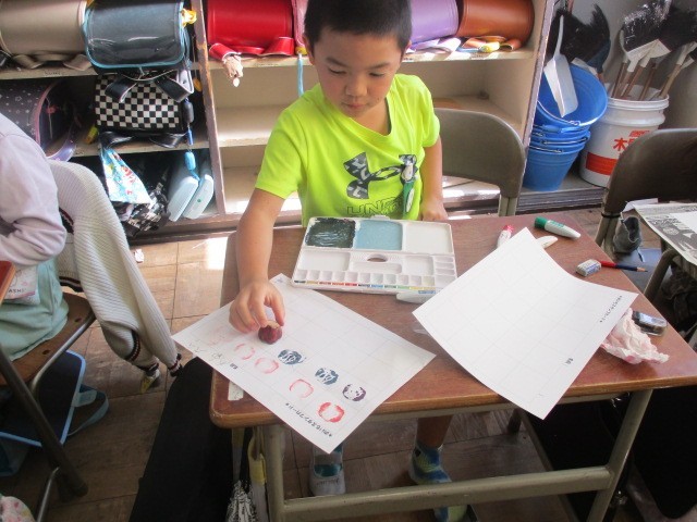 春の学校園に植えたサツマイモが暑い夏を越えて、なんとか収穫できました。お芋の出来はそんなにたくさんではなかったけれど、立派なツルがグングン伸びていて、とてもしっかりしたツルのリースが出来上がった後、細い目のお芋で「芋版」を掘って、ペタペタとスタンピングして楽しみました。