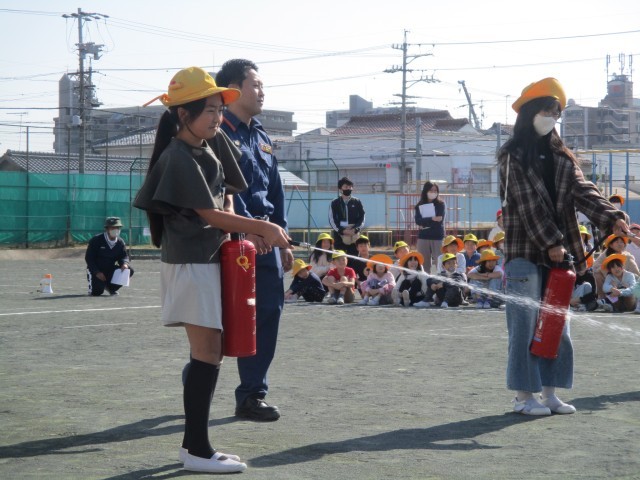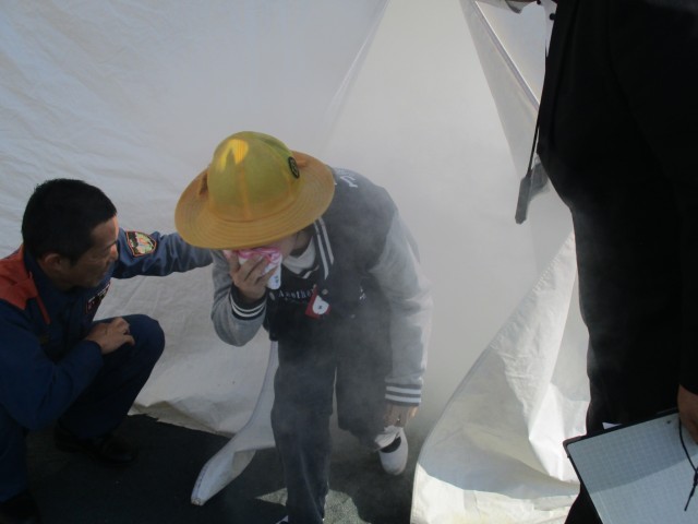 消防士の方をお招きして、避難訓練を行いました。いつもの訓練のように机の下に隠れたり、運動場に避難したりするだけではなく、消火器を使った消火訓練や、スモーク訓練も行いました。命を守るために必要な行動はどのようなものかを丁寧に教えてもらいながら、真剣に訓練に取り組んでいました。