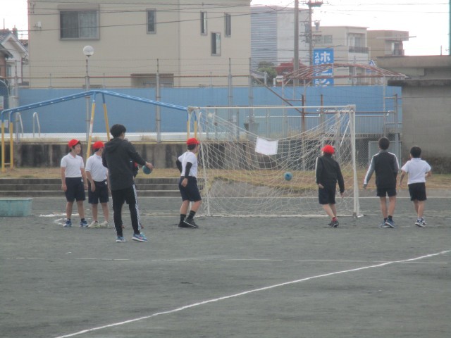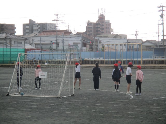 2組は外の運動場でハンドボールに挑戦!広いグラウンドを元気に走り回り、ドリブルやシュートに汗を流しました。ナイスプレーには歓声が上がり、活気あふれる授業となりました。
