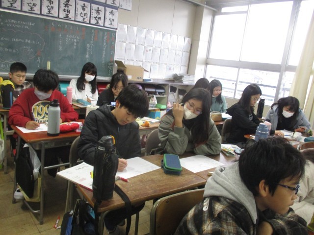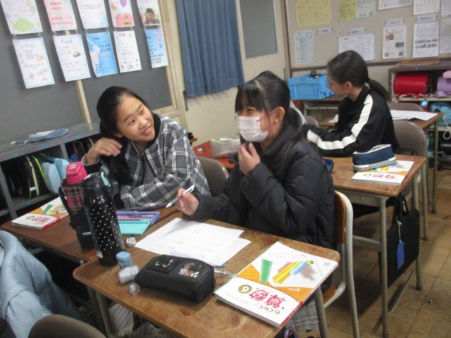 算数の学習では、2つの数量関係から、比例ではない関係に注目し、問題に取り組みました。問題文から表を作成し、表をたてに見たり、よこに見たりしながら特徴を見つけました。ペアになって、気づいたことを伝え合い、話し合います。反比例の関係を学習中です。