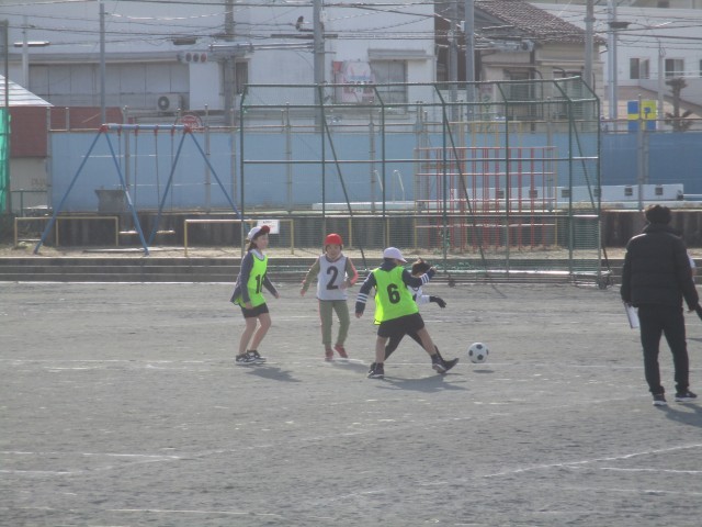 チームに分かれて、いざ対戦。なかなか思うようにボールが運べなかったり、うまく味方へつながったり。楽しそうにボールを追いかけていました。