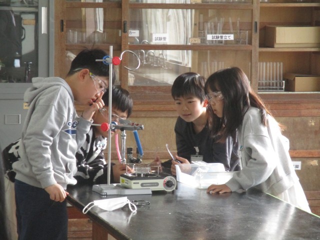 水のあたたまり方を予想しながら、実験に取り組みました。試験管の底の部分をあたためたり、試験管をななめに傾けて、水面近くの部分をあたためたりして、水のあたたまり方を観察しました。