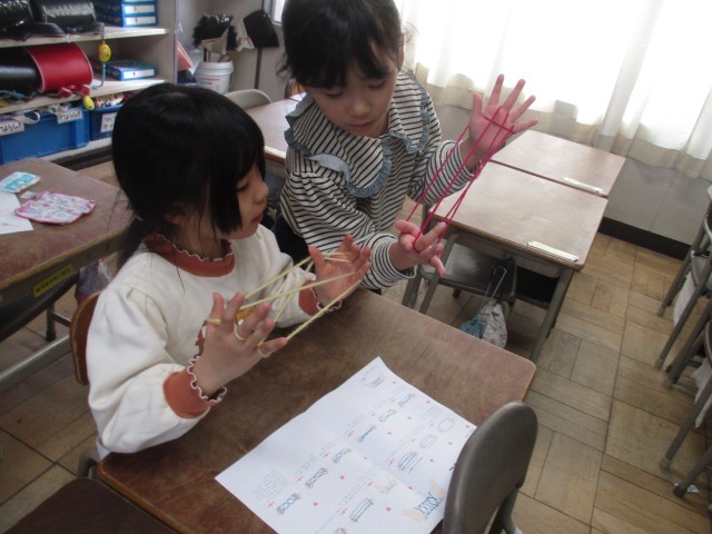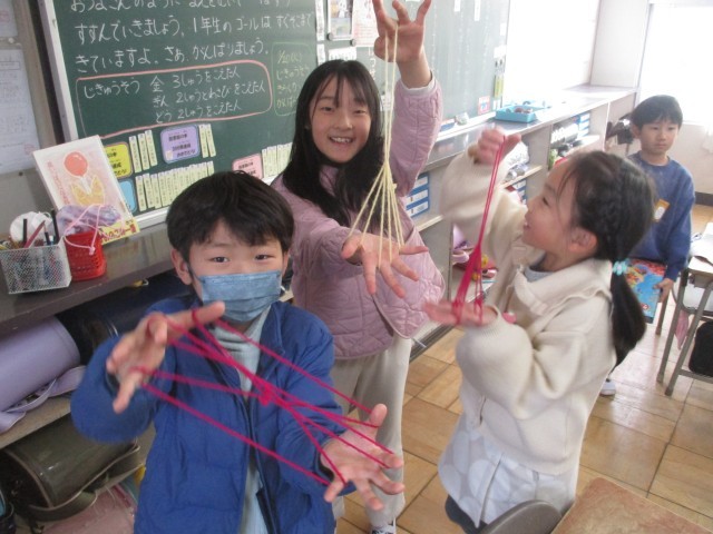 放課の時間に、1年生の教室をのぞいてみると、「見て見て できたよ」とあやとりを見せてくれました。
