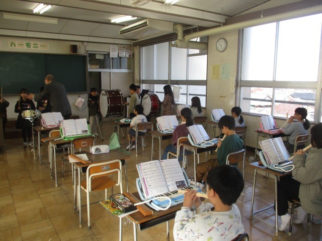 音楽の学習では、「せいじゃの行進」の楽譜に合わせて、リコーダー、鍵盤ハーモニカ、小太鼓、大太鼓を順番に担当して、演奏しました。音が重なり合って気持ちよかったですね。