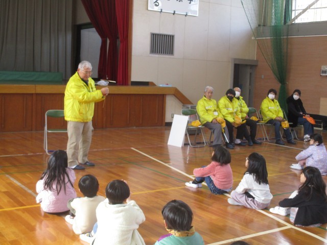 今日は、見守り隊の加藤さんに、竹とんぼの飛ばし方を教えてもらいました。子どもたちは、一人ずつ手作りの竹とんぼをもらい、上手に飛ばせると、嬉しそうにしていました。会の最後には、いつも登下校に付き添っていただいている見守り隊の方に感謝を伝えました。