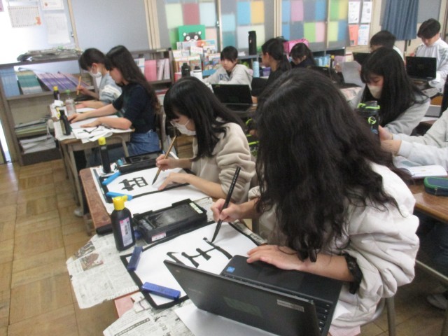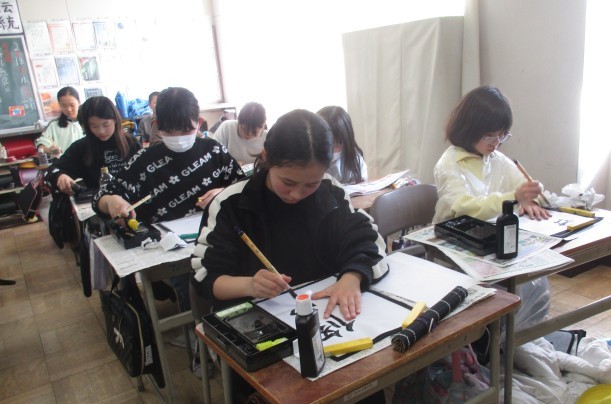 小学校生活をふりかえって、思い出に残った行事やことば、中学生に向けて大切にしたいことばや決意などから、自分の書きたいことばを決めて半紙に書いてみました。小学校生活最後の書写作品となります。それぞれの思いが込められた作品となりそうです。