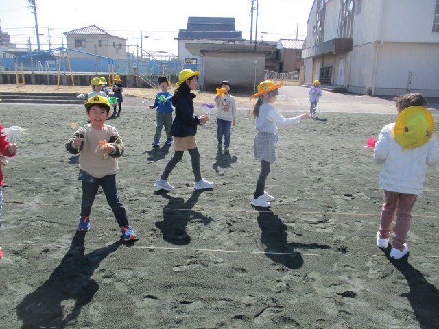 外に出ると、「こっちを向いた方が回るよ。」「走ったらよく回ったよ。」と楽しく活動していました。