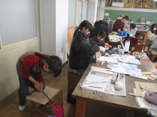 小学校卒業前の最後の製作かな。図工の学習では、木を切ったり、くぎやねじ、ボンドでくっつけたりして、ティッシュケースや小物入れ、棚を製作しています。