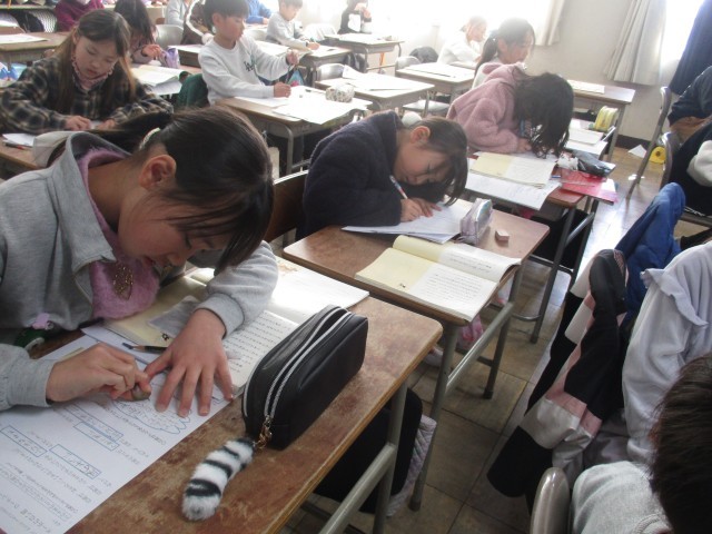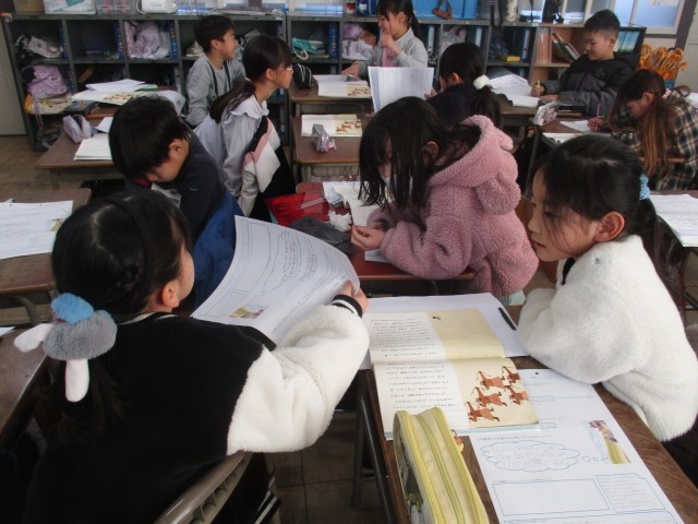 国語では、「スーホの白い馬」を学習していました。物語の様子をつかみ、想像しながら、背中にたくさんの矢がささったまま必死に走っていく馬の気持ちを考えました。ペアで、グループでそれぞれの意見を交流させ、全体で共有しました。