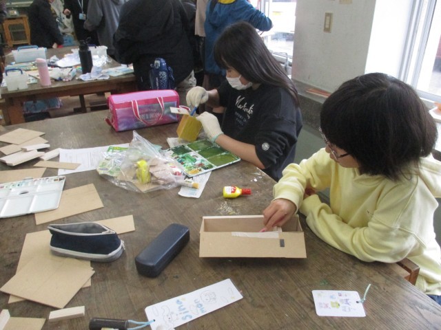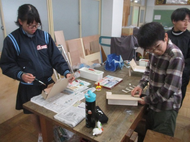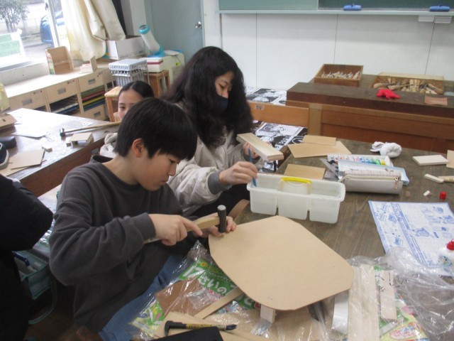 これまでに学習したことをつかって、板を切ったり、くぎを打ったりと製作を続けています。もう一息で完成かな。