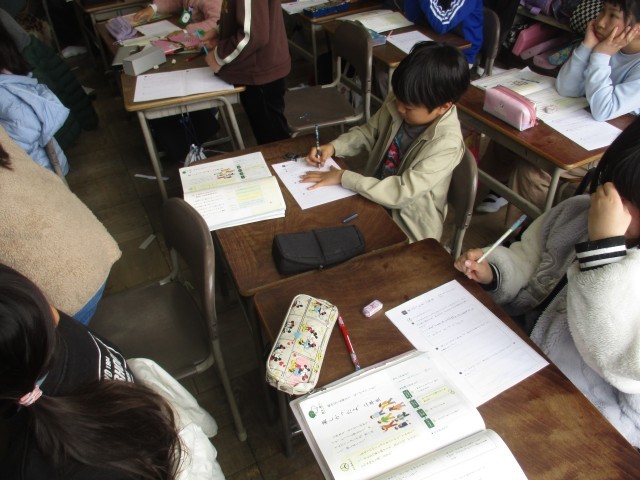 国語の学習では、「楽しかったよ二年生」で一年間を振り返って、二年生の思い出を組み立てを考えて文にします。みんなの前で発表するときに大切なことも考え合いました。みんなは、どんなことが一番の思い出かな。