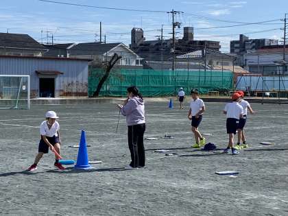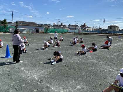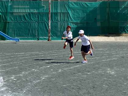 5年生は、トラックを使ってリレーの練習をしました。相手とスピードを合わせ、速く走れるように工夫をしていました。