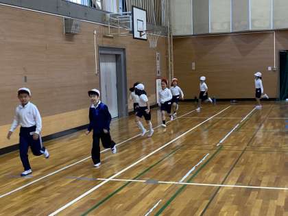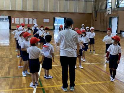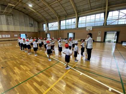 体育館で、整列や準備運動のしかたを学習しました。去年より上手にできました。去数が2年生!