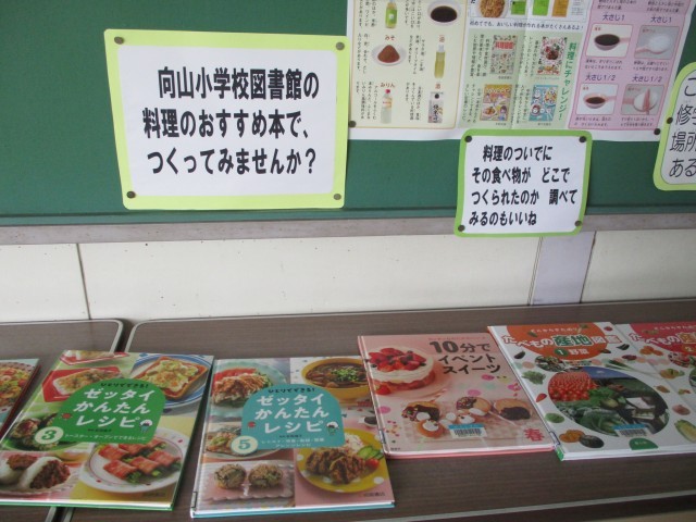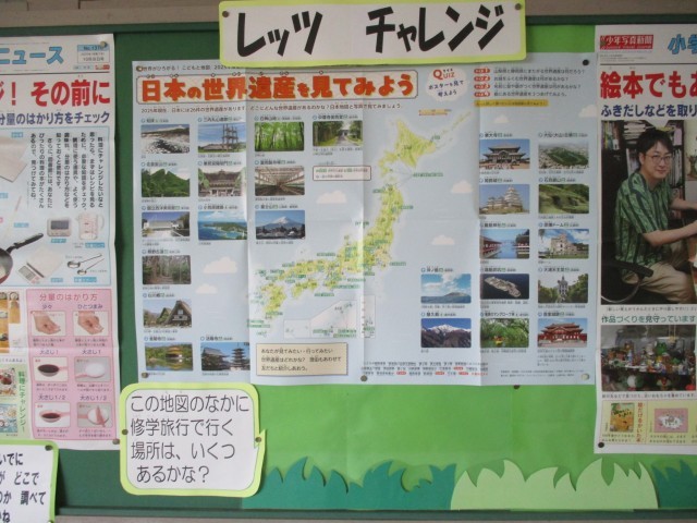 図書館前には、心ひかれる本や掲示物が私たちを誘っています。日本の世界遺産の掲示物には、来週修学旅行に出かける六年生に、京都奈良の世界遺産についての呼びかけがされていました。また、食欲の秋にふさわしい料理の本の紹介もされています。世の中はまだまだ知らないことだらけ、楽しいことがいっぱいです。ぜひ、図書館に足を運び、新しい世界の扉を開いてみてくださいね。