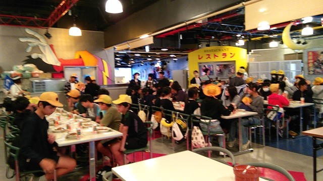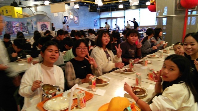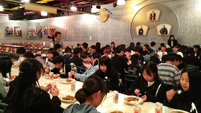 お昼はカツカレーをいただきます。食事の後は、いよいよアトラクション巡りとおみやげ購入です!