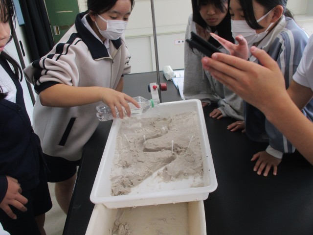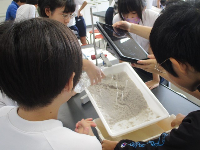 子どもたちは、水の流れの速さや傾斜を変えながら、土や砂が「けずられ(侵食)」「運ばれ(運搬)」「積もる(堆積)」様子を熱心に観察していました。