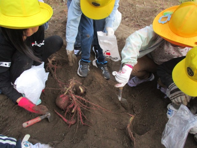 今日は待ちに待ったサツマイモ掘りをしました。スコップを持って、まるで宝探しのようにサツマイモを探しました。