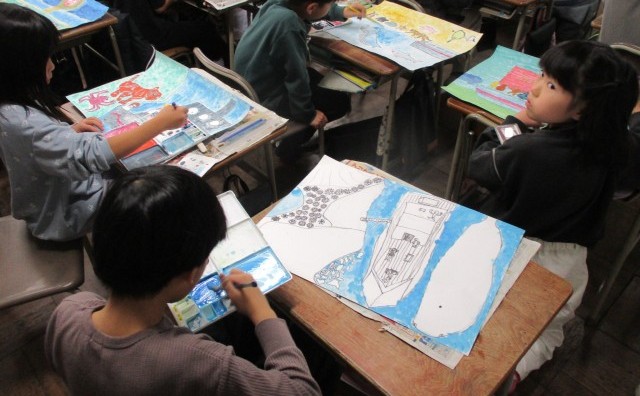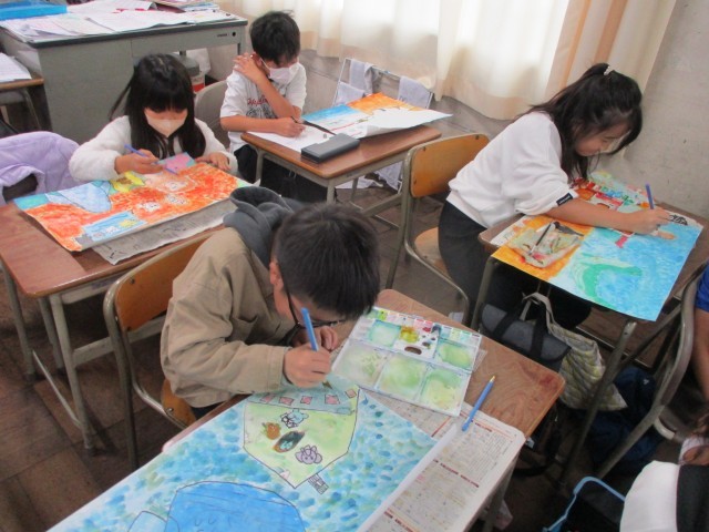 図工では、読み聞かせを聞いて、印象に残った場面や感動した場面をたくさん想像して、読書感想画を描いています。絵の具で表現する際は、配色や色の濃さなどの色塗りの仕方を工夫しています。構図から色の塗り方まで一つ一つこだわって、独創的な世界を作り出していきましょう。素敵な作品の完成が楽しみです。