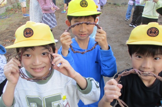 先日取ったサツマイモのつるでリースを作りました。日ごろお店でさつまいもが売られているのはよく見ると思いますが、つるを見たり触ったりする経験ははじめての人が多いようです。思い思いに曲げてねじり、リースの形に仕上げていました。