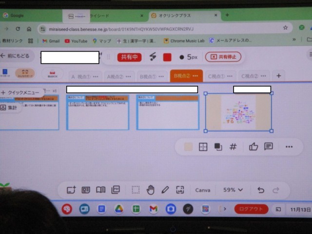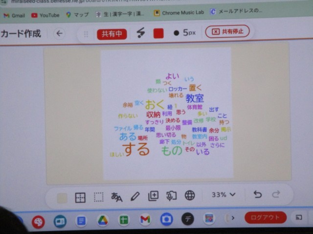 学習支援アプリを活用した研究協議会の充実をめざして、現職教育を行いました。テーマに従い、各自が意見を書き込み、共有ボードに投稿をし、リアクションやコメント、キーワード表示をもとにファシリテーターが意見をまとめていきました。学習支援アプリは児童の学習で活用を図っていますが、教員の協議にも有効に活用できます。また、使いながら考えたりひらめいたりした活用のアイデアは、授業にも応用できそうです。話し合いが焦点化され、充実するものになるよう今後も活用を進めていきます。