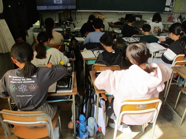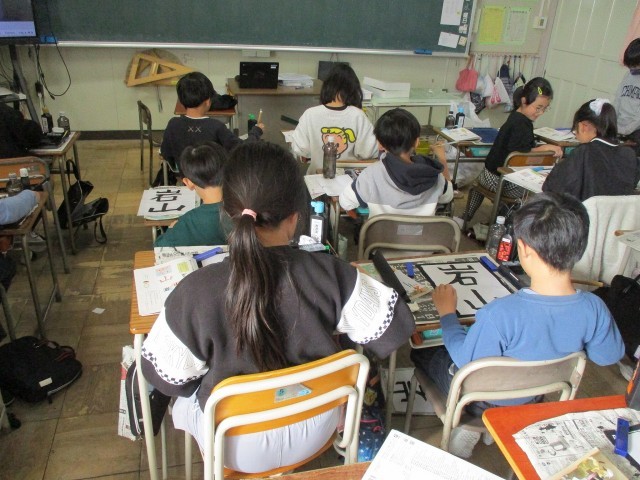 集中して毛筆に取り組んでいました。自分が納得するまで書き直したり、一文字ずつの練習をしたりしていました。毎授業ごとに形の整った字を書けるようになり、友達や先生に嬉しそうに見せている様子も見られます。